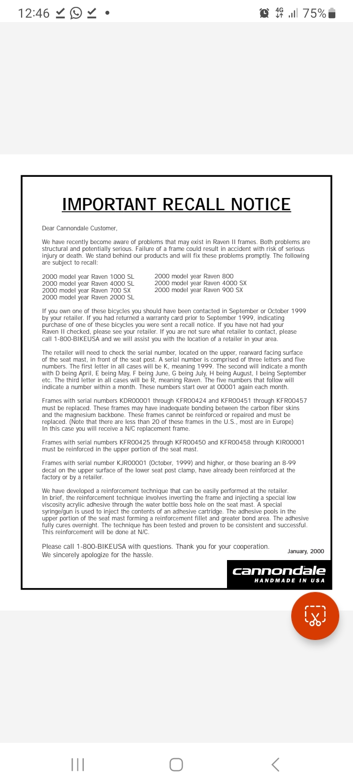 If memory serves me correctly, this recall only applied to the first gen Raven frames, not the second gen you have.