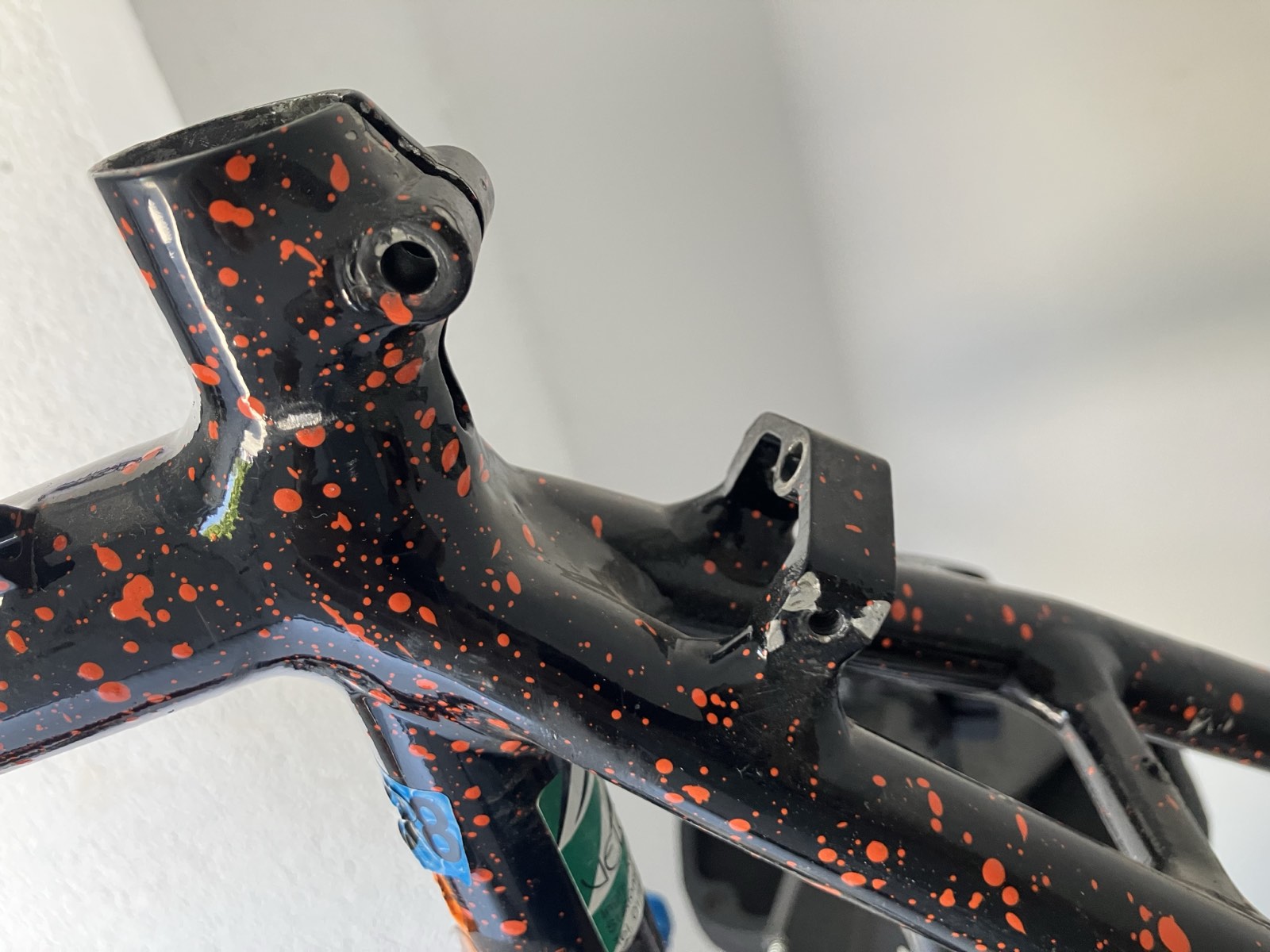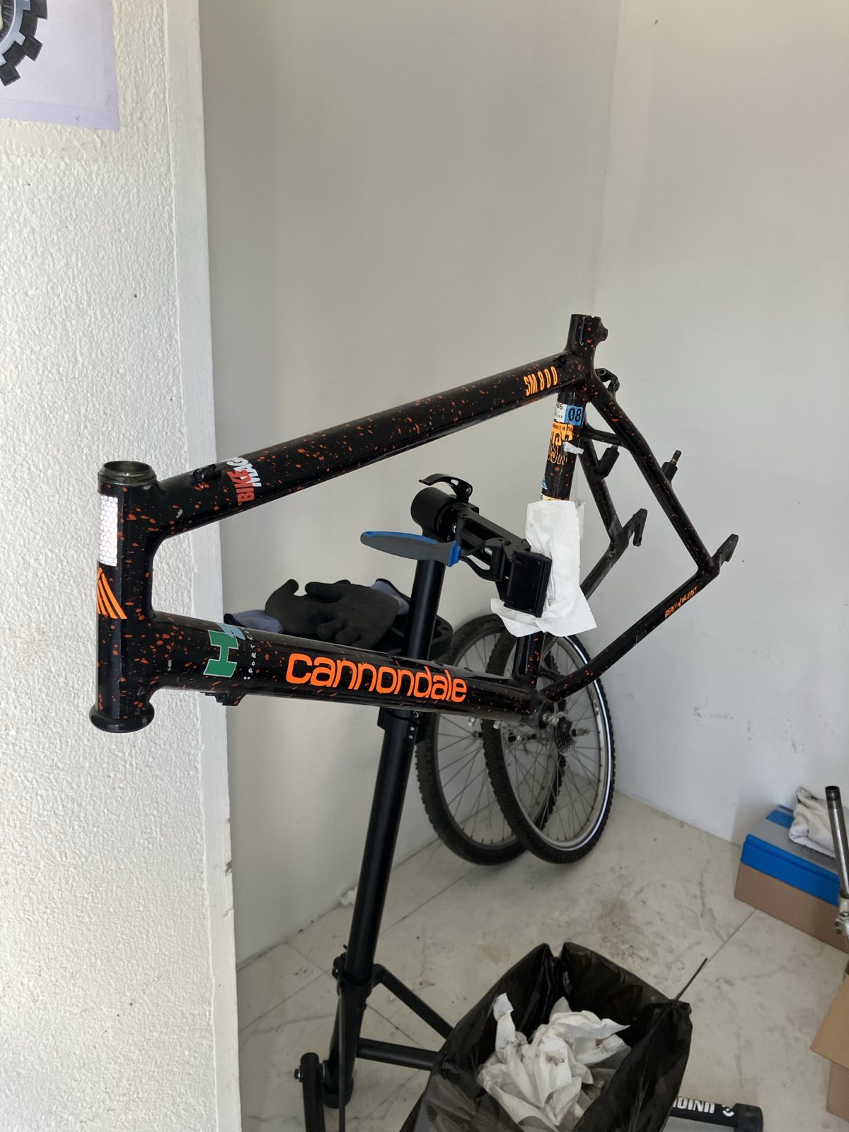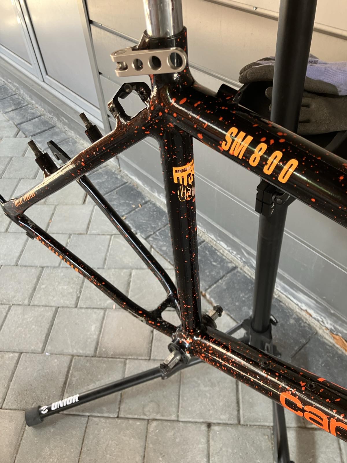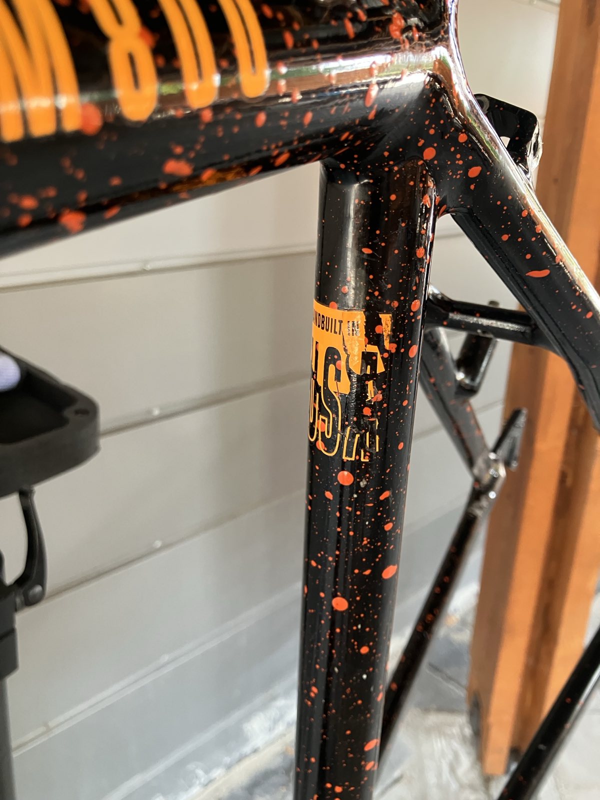 The frame is now sticker-free and cleaned up(not thoroughly). The "Handmade in USA" decal is a sticker and in pretty bad shape - I will likely have to remove it to polish there.