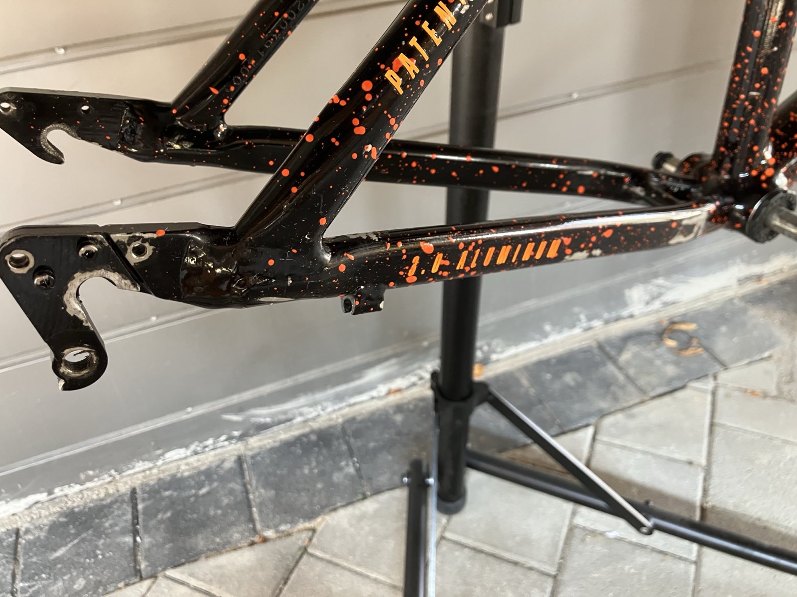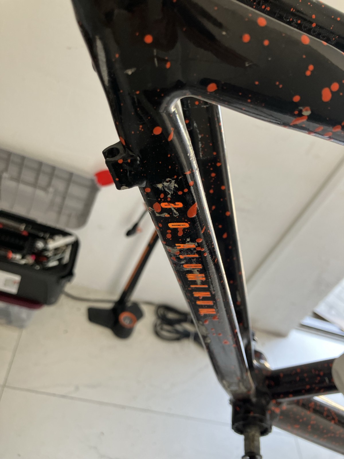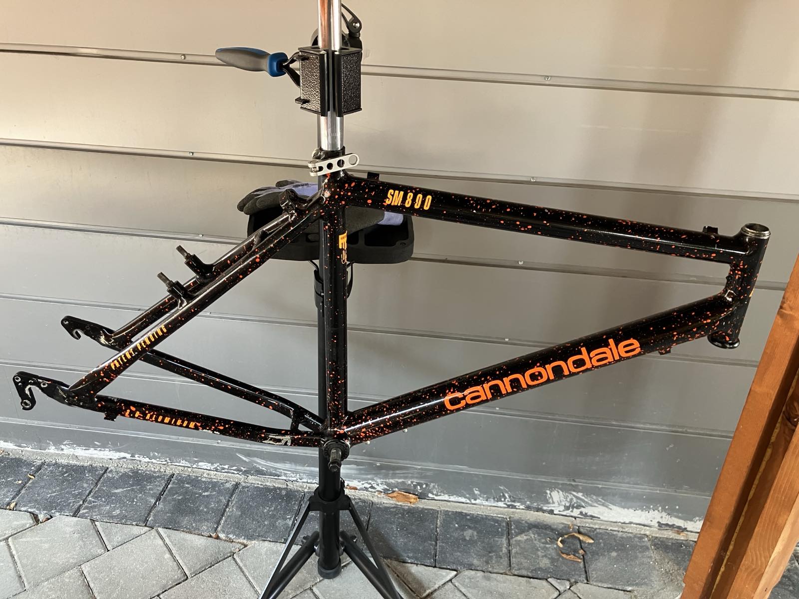The frame is now sticker-free and cleaned up(not thoroughly). The "Handmade in USA" decal is a sticker and in pretty bad shape - I will likely have to remove it to polish there.